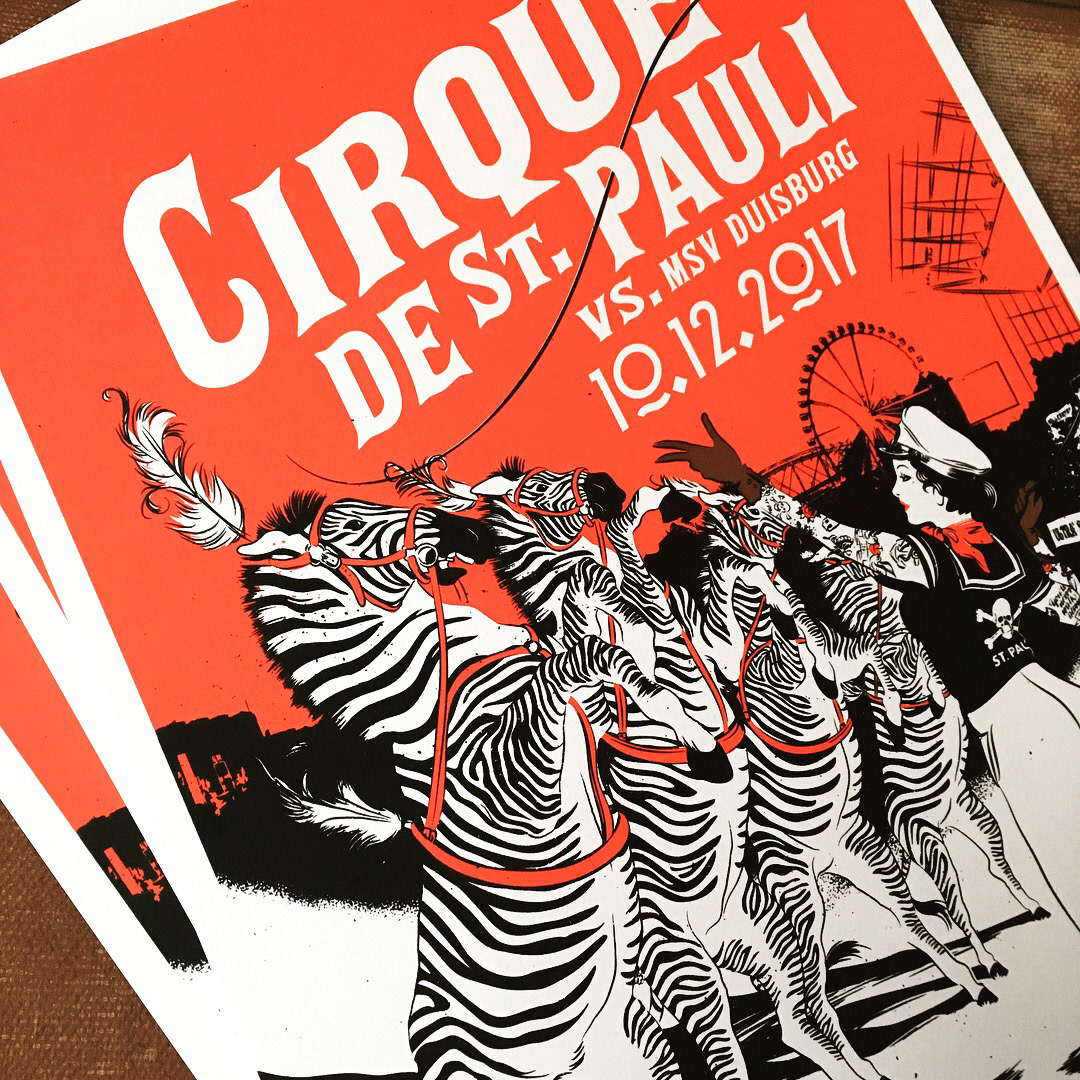 Himmelarsch! Ich durfte den Heimspielprint für das Match des FC St. Pauli gegen die Zebras vom MSV Duisburg am kommenden Sonntag gestalten. Ein dickes DANKE an das Millerntorgallery-Team und diesen fantastischen Ehemann, den ich an meiner Seite habe. Ohne seine Unterstützung und sein Verständnis würde ich so manches Projekt nicht machen können.